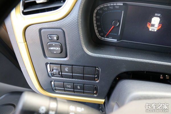 转向柱左侧布置有大灯高度调节、后视镜电动调节及电加热、驾驶室翻转等控制按键。雨雾天气时使用后视镜电加热按键,可及时清除镜面水汽,保证驾驶员视野清晰,非常实用。