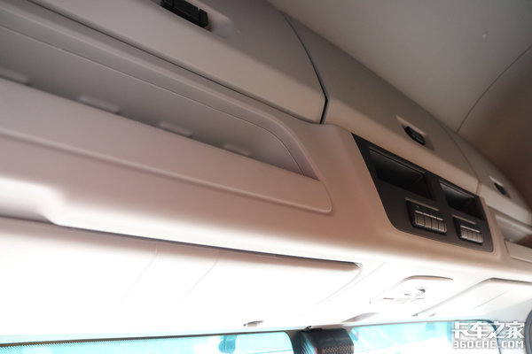 因为是高顶驾驶室,驾驶室内的储物空间十分丰富,车内分布有三个大容积的储物格和几个开放式的储物槽,两侧车门上方也安装有储物网兜,方便驾驶员随车携带各种日常生活用品。