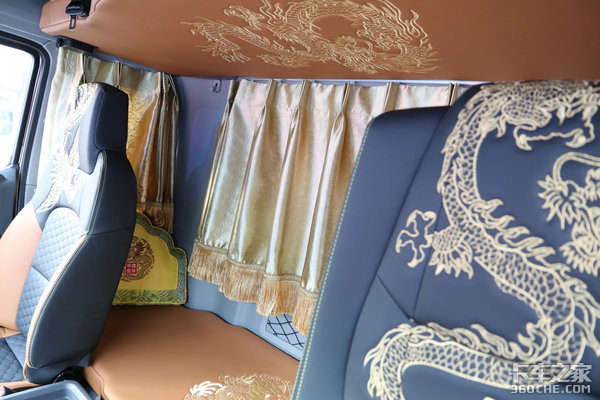 主驾驶座椅是装饰有龙图案和“御匠亲制”字样的龙椅,副驾驶座椅是装饰有凤凰图案的凤椅,龙凤搭配寓意龙凤呈祥。这样高规格的座椅在商用车领域我敢替大黄蜂说一句:除了我还有谁,毕竟驾驶员上车如同登基、开车如同御驾亲征,这样的体验在别的卡车上可没有。
