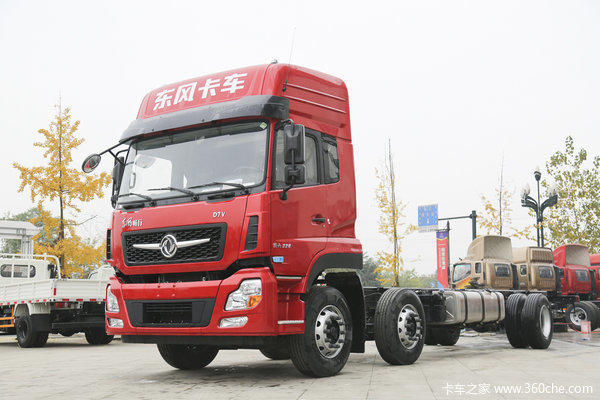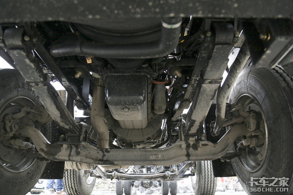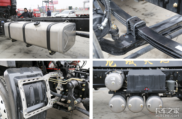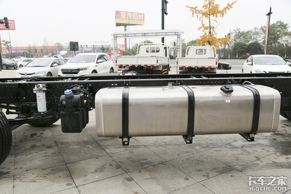 轻量化是这款东风畅行D7V的一大优势,通过采用少片簧设计、铝合金油箱、铝合金储气筒以及铝合金支架等轻量化零部件,在保证车辆承载能力完善的前提下,为底盘降重提供了下探空间。据了解,该车底盘自重大约在7.2吨左右,如果是低顶驾驶室的话,自重则会更低,在6.4吨左右。