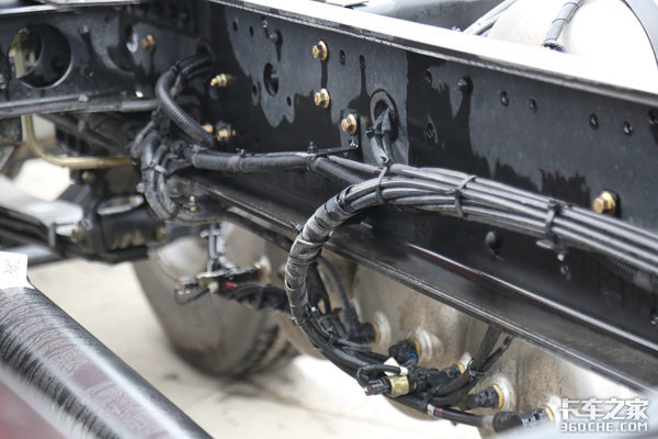 从图上可以看到,这款东风D7V在电器线路布局上还是比较规整,包扎走线做的都挺到位。在一些容易与车架接触的位置,采用了橡胶垫等软连接,可以有效降低在行车过程中所带来的磨损。