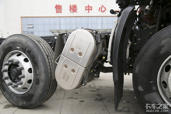 车辆底盘左侧布置有柴油滤芯、尿素罐和一个600升铝合金油箱。相较于常规的350升油箱来说,这种600升大尺寸油箱能够满足更长的续航里程,基本上跑个2000-3000公里问题不大,而且也不用频繁进入加油站,能够更好适应快递快运这种高强度、高时效性的运营场景。