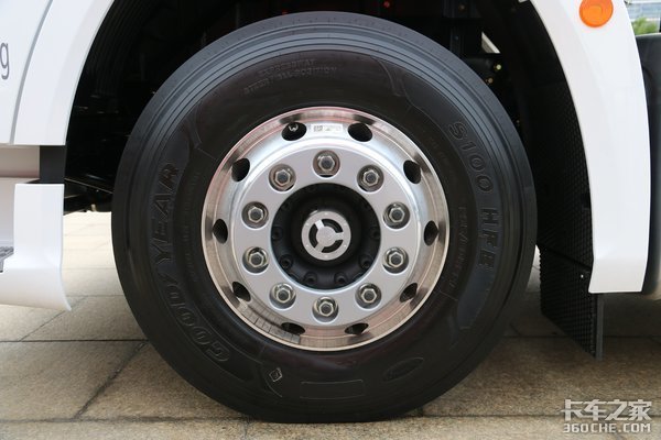 底盘方面,这辆J7六个车轮全部采用铝合金轮辋,大大减轻了车辆自重。轮胎规格为固特异品牌的295/80R22.5。同时还配备了爆胎应急安全装置,高速行车更安全。