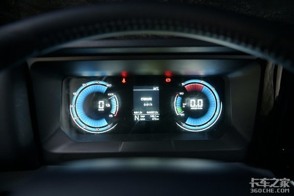 仪表盘两侧为彩色液晶显示屏,点亮之后为指针式仪表盘样式,带有车辆时速、转速、剩余电量等关键行驶数据。再加上中间的小块显示屏,方便驾驶员随时查看各类行车数据。