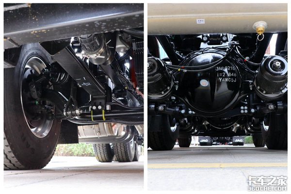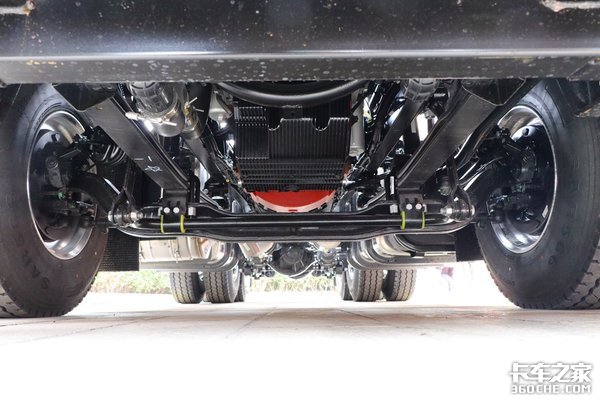实拍车前桥采用锻钢件材料,工字形断面结构,后桥采用单级减速康迈轮端,前后桥均采用50万公里免维护康迈轮端,后桥速比2.846(同时可选3.083)。