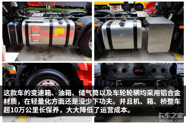 这款车的变速箱、油箱、储气筒以及车轮轮辋均采用铝合金材质,在轻量化方面还是没少下功夫。并且机、箱、桥整车超10万公里常保养,大大降低了运营成本。