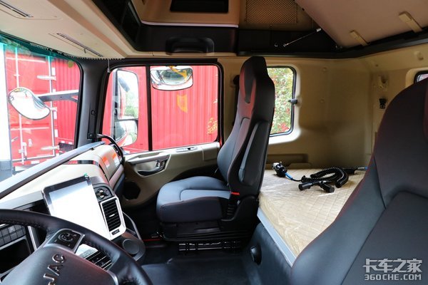 这款车的驾驶室采用有着通过性好、空间大特点的A5III平地版新内饰长途之家驾驶室,采用四点气囊悬浮悬挂。驾驶室内饰整体配色选择深灰+浅米配色,看起来非常温馨。考虑到跑快递一般都是两人搭班,那么高顶双卧就是不可或缺的配置,休息区的卧铺非常的宽,能给驾乘人员一个舒适的休憩环境。(浅米色区域均采用皮质包裹,质感也是非常的不错。)
