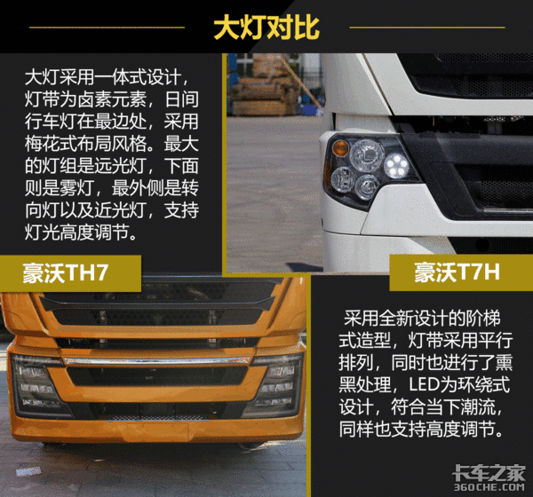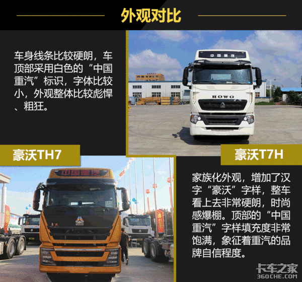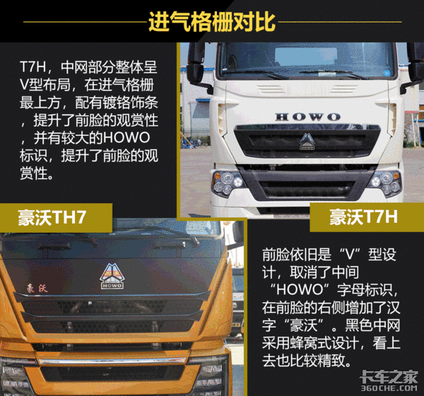【卡车之家 原创】豪沃T7H和TH7,虽然对标的都是高端运输市场,但是豪沃TH7,在外观、内饰、底盘上,相对于豪沃T7H,都作出了不同程度的改变,豪沃TH7的配置更加的豪华。