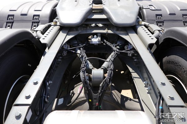 在桥体方面,豪沃T7H后桥部分装有V型推力杆,防止后桥前后和左右移位,在一定程度上保证了车身刚性和承重强度。横梁部分采用超轻量化整体冲压工艺,减轻质量的同时保证强度。
