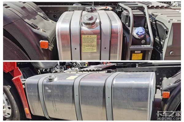 实拍的豪沃T7H使用的是1000L油箱,豪沃TH7则使用的是1100L双油箱,材质都是铝合金。单从油箱容积上来看,豪沃TH7的续航能力要比豪沃T7H的稍微强一点。