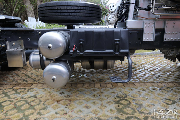 实拍的这款H7 LNG车型底盘采用了堆叠式的布局,车架座舱是容量为500L的侧置气罐,右侧是铝合金储气罐和电瓶以及后处理系统。