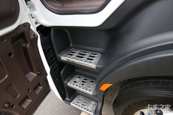 打开车门我们就可以发现实拍的这款乘龙H7 LNG牵引车配有三级蹬车踏板。踏板表面采用镂空防滑设计,大大避免了驾驶员上下车辆时脚底打滑或将泥土等污渍带入车内。