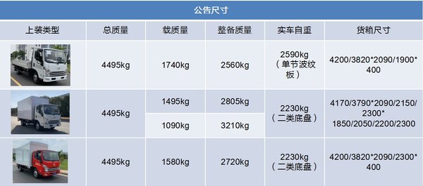 除此之外,厢车、仓栅上装的公告齐全,同样属于自重合规的蓝牌轻卡,具体货箱尺寸以及公告质量、额定载质量可以参考下图。