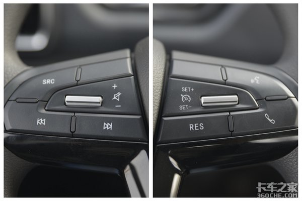 当高速行驶时,一秒钟车辆可能会行驶数十米,在这种情况下单手操作中控台按键非常危险。为此,上汽轻卡C300把主要的功能按键都集成设计在了方向盘上,左侧为多媒体、音量等控制按钮,右侧是定速巡航的控制按钮,手不离方向盘就可以操作。