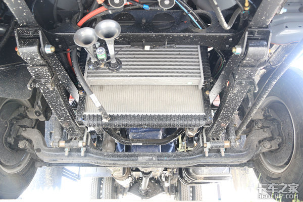 油箱设计是全车的亮点之一,油箱与尿素罐高度集成化,容积分别为120L、20L,但两者的加注口是分开的,两个加注口的外观、颜色不同,非常容易区分,可以避免驾驶员加油或加尿素时加错。油箱及尿素罐的材料为树脂复合材料,经受撞击后不易开裂漏油,安全性较高。