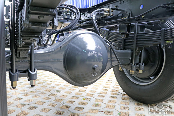 后桥采用的9吨级后桥,速比为4.364,整车总速比为3.45。整车制动系统采用鼓式制动器,悬架型式为前后多片簧式悬架。