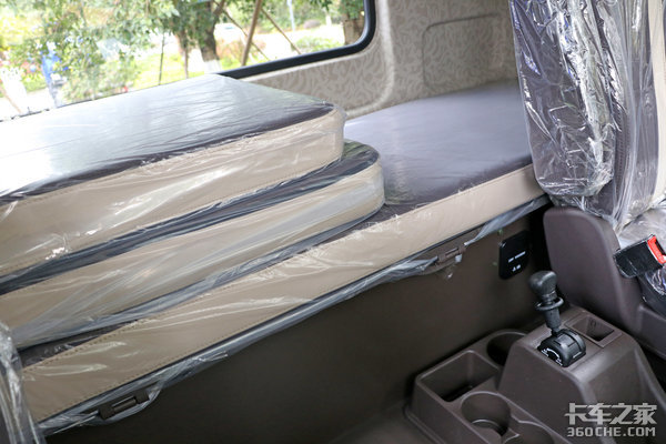 实拍车配备了上下双卧铺休息区,在上卧铺尺寸方面于现款保持一致,而在下卧铺则是采用了1米的折叠式双人床设计,这款1米的大卧铺我想众位卡友都不陌生,不仅休息空间加大,躺卧更舒服外,对于夫妻档跑车的卡友来说更是十分贴心。