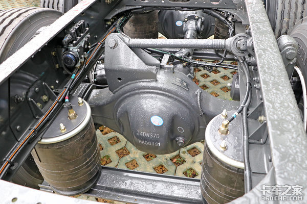 实拍车在后桥位置采用了4气囊的空气悬架,气囊桥还带有横向稳定杆。对于8X4载货车来说,后桥采用气囊悬挂,就意味着它能比普通板簧悬架的车型多装1吨货,达到车货总重32吨,多装一吨货就意味着收益增加。