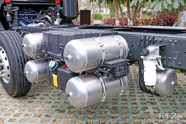 在车辆左侧的第二转向轮靠后位置,我们可以看到布置有储气罐、电瓶和尿素罐。最引人关注的还是整车多达6个的大容积储气罐,还有两个在大梁内部,这么多的储气罐除了控制整车制动、座椅和驾驶室之外,还有独立的储气罐专门供应气囊悬挂使用。