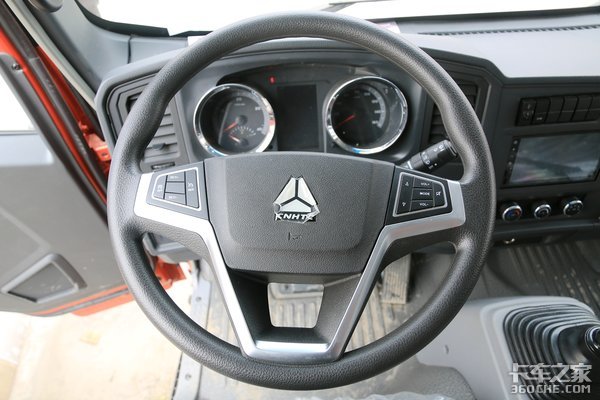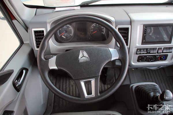 内饰上,标配有彩色仪表,将表盘大致可以分为3个区域,左边为发动机转速表,右边为车辆的时速表,中间的显示屏主要显示车辆的油耗。方向盘则为普通的三辐式设计,喇叭开关布置在重汽LOGO下方,操作上比较方便。
