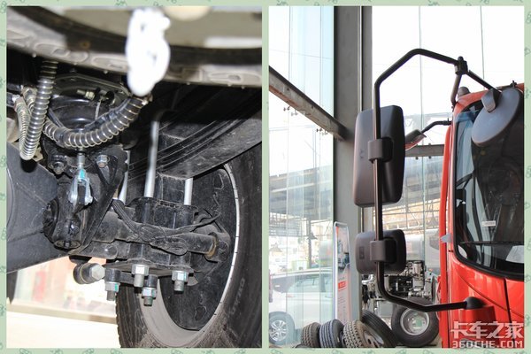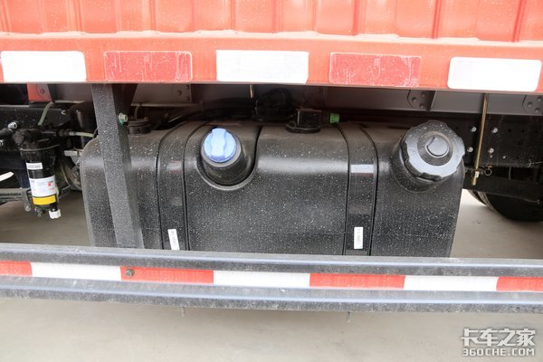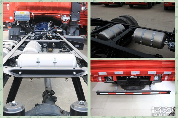 悬架上采用前3后5+3的片簧设计,后桥速比是4.875。油箱为高度集成化一体式设计,油箱、尿素箱共用一个支架,节省了尿素箱的支架,维修上也比较方便,同时也可以降低整车自重。轮胎则使用7.00R16 8PR高强钢轮真空胎,使车轮的自重更轻。