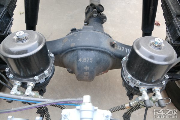 前后桥均使用的是汉德后桥,后桥速比是4.875。油箱为150L铝合金油箱,可以有效降低整车自重。柴油滤清器可以选择干湿二合一滤清器,过滤效果更理想,同时也节省了底盘的空间,减少了车架附件,而且也可以减少底盘故障点,让车辆周转效率更高。