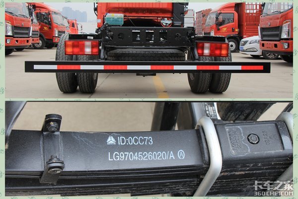 在整车轻量化的同时,豪沃小金牛系列车型也没有舍弃车辆的承载力,采用等高、全贯通、高强钢180车架,板簧悬架也是使用的高强度板簧,自重轻的同时,承载力以及刚度表现也比较好,超宽的轮距后桥,可以匹配2300/2450的超宽货箱。