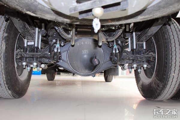 在悬架方面,采用前3后3+2的片簧设计,前桥为1.5t级,后桥为2.5t级,后桥速比则是4.875。前后桥均配有桥磨损报警系统,能够准确的监测桥磨损的程度,在达到极限状态时发出报警信号,从而达到预见性维修的目的。油箱则为120L的铝合金油箱,可以有效降低整车自重。