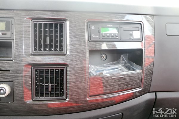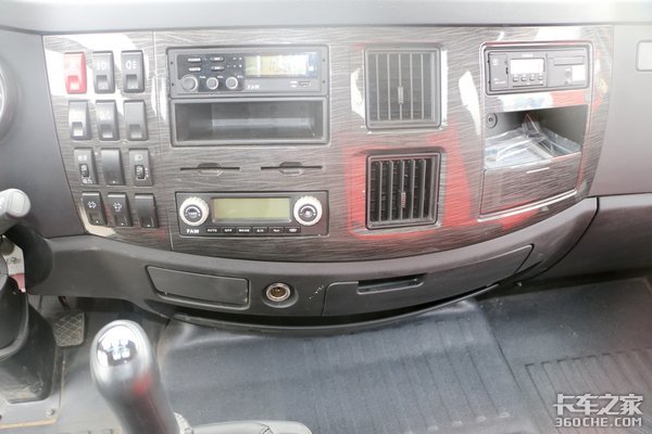 整个中控台,大致可以分为4个功能区,最左边的区域为机械键盘区,像危险警示灯开关、大灯高度调节开关、排气制动开关等均布置在此区域。旁边紧挨着的则是娱乐休闲区。因为这款车对应的是“质惠”,所以MP5并不是标准配置,可以进行选装,同时也是为了节约卡友的购车成本。