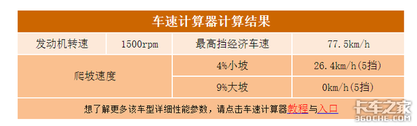 这辆车的性能到底怎么样呢,让我们通过卡车之家时速计算器来了解一下吧。通过计算,该种配置下的解放J6L,发动机在1500r/min时车速可以达到77.5km/h的经济时速,另外在攀爬4%大的斜坡时,速度可以维持在26.4km/h。