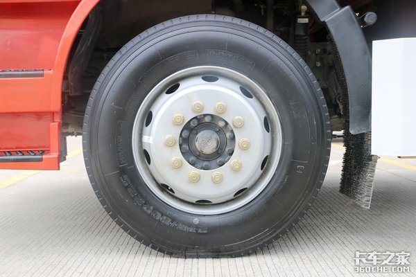 轮胎的规格为275/80R22.5。整车目标是向轻量化靠拢,离不开车辆上每一个配件的努力,为了降低轮胎的自重,轮毂上采用多孔设计的方式,同时也有利于轮胎的散热。