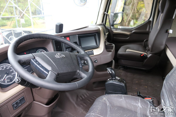 这款车的驾驶室采用四点气囊悬浮悬挂,高顶双卧平地板的设计让驾驶室不仅看起来更加宽敞,乘用也来也更加舒适。四幅式设计的多功能方向盘采用皮套包裹,不仅握感不错,还非常实用。中控台采用半包围驾驶员的设计,配备有10.8英寸的显示屏,可以实现收音机、音乐、视频以及手机互联和360全景显示等功能,非常实用。
