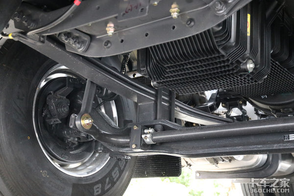 实拍车的后桥采用的是重汽MCY13JES后桥,后桥速比为2.71。实拍车的轮胎选择的是米其林轮胎,轮胎规格为295/80R22.5,采用双油箱(铝合金壳体)的结构。这款车的底盘布局非常紧凑,并且密而不乱,看起来非常舒服。