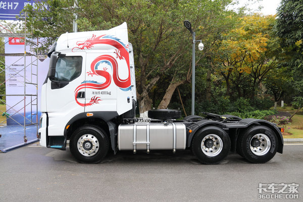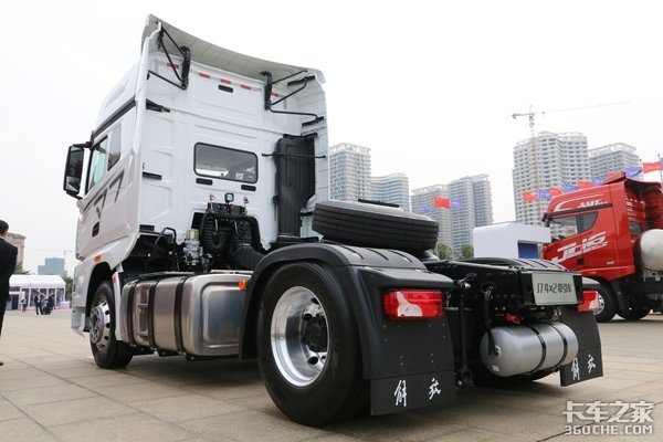 传动系统与之匹配的是法士特16挡AMT变速箱,前进档位16个,倒挡两个。这款变速箱的头挡速比为14.02,最高挡挡速比为0.83,次高档为直接挡实拍车采用13T后桥,采用双铝合金油箱结构,容积为880L+300L,轮胎来自固特异,轮辋为铝合金材质,规格为315/70R22.5。