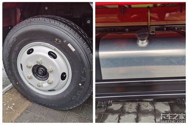 实拍车的轮胎选择的是万力真空胎,规格为7.00R16,同时可选规格为7.50R16的真空胎。装配有一容积为130L的铝合金油箱,同时还可选塑胶材质100L容积的油箱。