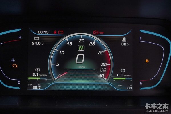 仪表盘采用了全液晶的仪表设置,各种行车信息比较丰富。转速表采用传统样式,车速表为数字式显示,设计非常新颖,同时分辨率很不错,这套仪表盘的液晶显示屏是领途的加分项目,也是一台定位高端的轻卡的身份体现。