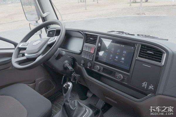 内饰整体用料为搪塑软质材料加上黑棕拼色塑料材质为主,整体质感更上了一个台阶。仪表盘、手拖位置都经过了仿皮包覆和缝线处理,这一方面也体现了解放领途在打造更舒适轻卡内饰上面的用心。