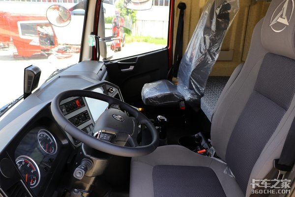 实拍车搭载的是高顶排半驾驶室,标配有后视镜电动调节电加热、中控台彩色大屏、GPS/北斗行车记录仪、多功能方向盘、电子中控锁以及支持多项调节的气囊座椅等。