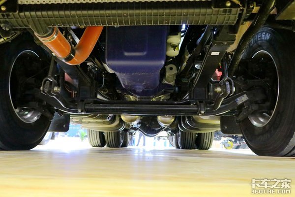 底盘方面,实拍车装配的是规格为12R22.5轮胎,装配有800L容积的铝合金油箱,后桥采用汉德425冲焊桥,后桥速比为3.7,采用前2后3少片簧的钢板弹簧悬挂,在保证车辆承载能力的同时,还可以有效降低车身自重。