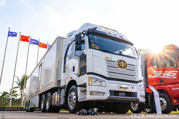 这款车是解放J6P荣耀版+智能冷藏半挂车的列车,一体式设计让主车和挂车能够得到更好的契合,从而在风阻、轮胎滚阻、轻量化等各个方面进行系统的匹配,进一步降低运营成本,提升利润。