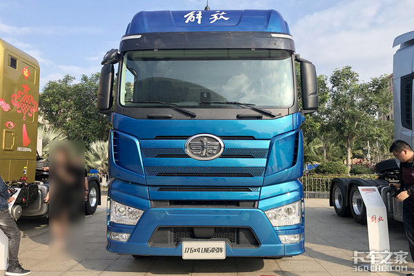 我们先看外观,这款解放J7 LNG车型与燃油车型在造型设计上保持了一致的风格,整体看上去还是那么的高大威猛。车身涂装采用海蓝色,再加上车顶位置白色为底的“解放”两字,该车型的辨识度很高,行驶在公路上绝对是“最靓的仔儿”。