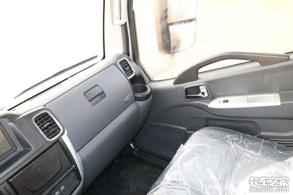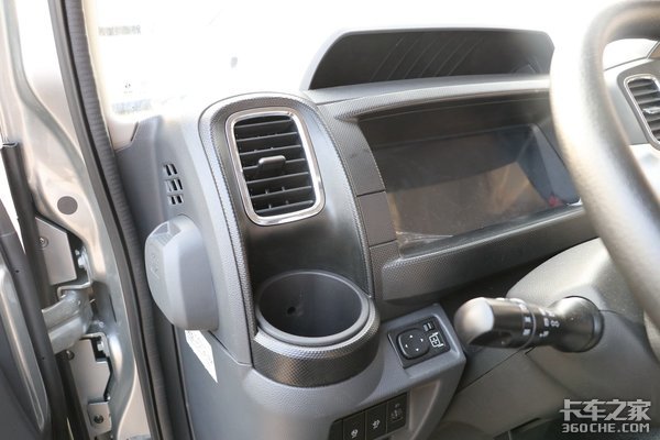 另外,空调出风口设置杯架这一设计十分讨喜,方便驾乘人员喝上冬暖夏凉的饮品,另外,后视镜的角度调节并没有像传统轻卡设置在车门之上,而是设置在了主驾驶杯架旁。