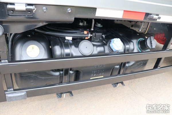 油箱方面,实拍的凯普特星云采用了为黑色塑料材质,高配车型的油箱为铝合金材质。值得一提的是,凯普特星云的油箱和尿素箱巧妙的集成在了一起,不仅造型紧凑,提高了底盘空间的利用率。