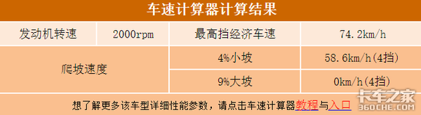 经卡车之家时速计算器计算得知,标载情况下,发动机在2000r/min时就可以达到经济时速74.2km/h,同等发动机转速下,当变速箱置于4挡位时,爬4%的小坡的速度在58.6km/h.