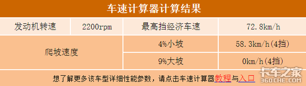 从卡车之家时速计算器计算得知,标载情况下,当发动机转速在2200r/min时,车辆就可以得到经济时速72.8km/h,当变速箱置于4挡位时,可以以58.3km/h的速度爬上4%小坡。