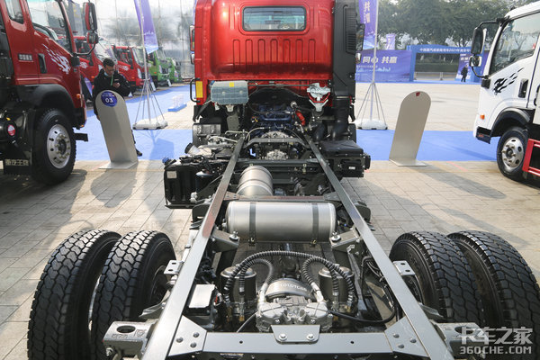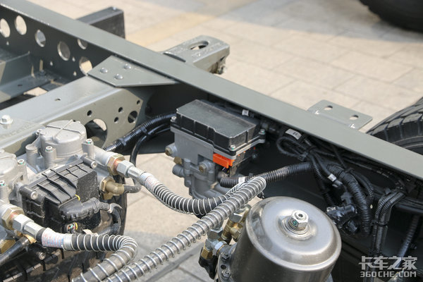 从图上可以看到,车架左侧布置有柴油滤芯、120升铝合金油箱、尿素罐,整个布局很紧凑,120升油箱对于城市配送以及乡镇运输来说,完全足够使用。。