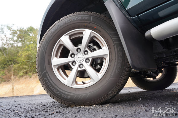整车装配型号为215/75R15的成山牌真空轮胎,并搭配六辐式铝合金轮圈,能有效减轻自身重量。