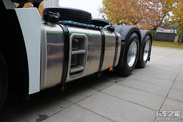 该车的油箱是采用双腔油箱的设计,可以加注高标号油箱和低标号油箱,即使行驶在寒冷的地区也能保障车辆的正常行驶。此外油箱是采用铝合金材质,很好的降低了车辆的自重,在油箱的正面,还设计了两阶层蹬梯,上下底盘视察车况更方便。