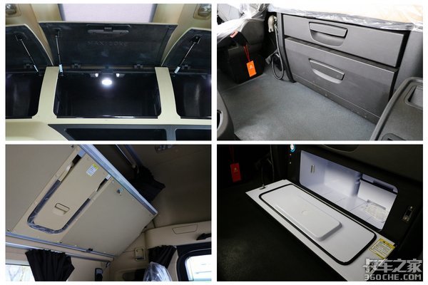 至于卧铺和储物空间方面,重卡的双卧没什么好说的,差不多就是这样的配置。不过上卧铺带有爬梯,上下卧铺的话更方便。而在储物方面,除了常规化的设计,在下卧铺还设计有两层储物盒,第一层为普通储物盒,而第二层则是一个车载冰箱。