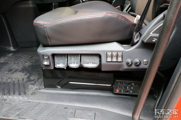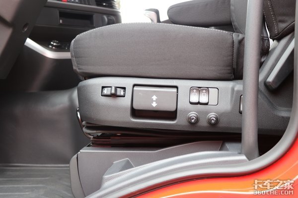 这款红岩杰虎的座椅整个采用尼龙材质的布面包裹,虽然不及皮面包裹得高挡,但是乘坐舒适度还是不错的。功能方面,这款车同样装配有两级腰部支撑以及通风加热功能,还是比较全面的。